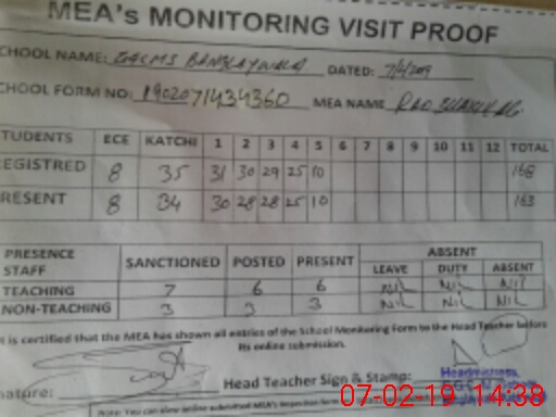 | Attendance Register | Head Teacher | MEA with School | Visit Proof |