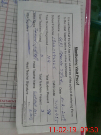 | Total no. of Classrooms: 3 No. of Classrooms Used for Teaching: 3 No. of Classrooms Storing Old Furniture, FTBs, etc: 0Comments if Any: AMOUNT RECEIVED RUPEES 70062 DATE 30 OCT 2018 BUT NOT SHOWN IN SYSTEM S I S RECORD S H N S ADEEL ARSHAD LAST VISIT THE SCHOOL DATED 18 SEP 2018 AFTER NO VISIT OF THIS SCHOOL TILL TO DATE PST NASEEM AKHTAR TEACHER WAS PRESENT BUT ON SYS |