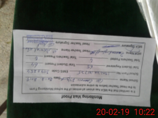 | Total no. of Classrooms: 2 No. of Classrooms Used for Teaching: 2 No. of Classrooms Storing Old Furniture, FTBs, etc: 0Comments if Any: S H N S ADEEL ARSHAD LAST VISIT THE SCHOOL DATED 11Sep 2018 AFTER NO VISIT OF THIS SCHOOL TILL TO DATE |