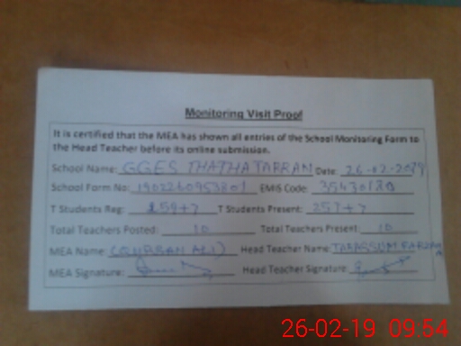 | Certified that this School was Inspected by the Undersigned MEA/DMO Today and the Information Stated Above is as Per Record. | |||||