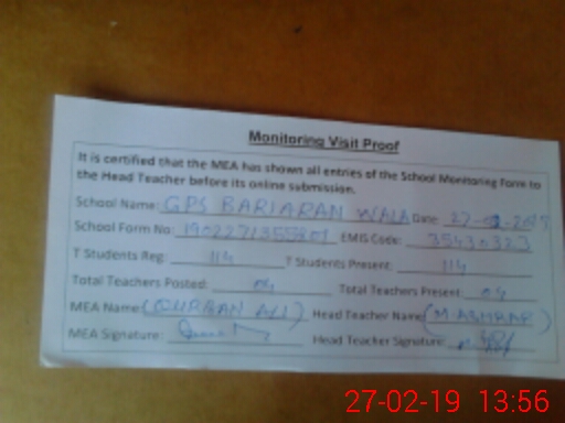 | Certified that this School was Inspected by the Undersigned MEA/DMO Today and the Information Stated Above is as Per Record. | |||||