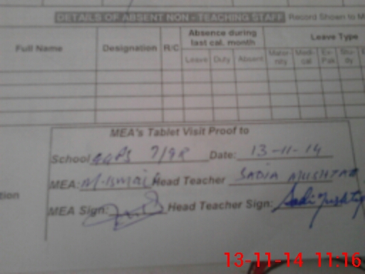 | Attendance Register | Head Teacher | MEA with School | Visit Proof |