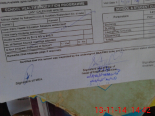 | School Visited by School Health & Nutrition Supervisor (No. of Visits) | Name1: | NOT APPLICABLE | Name2: | ||