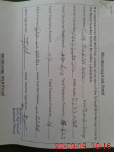 | Total no. of Classrooms: 15 No. of Classrooms Used for Teaching: 9 No. of Classrooms Storing Old Furniture, FTBs, etc: 0Comments if Any: Muhmmad Ramzan pst posted in this sohool and present but his name is not entered in my tab Imtiaz husain sst is posred in this school and present buhis name is not entered in my tab |