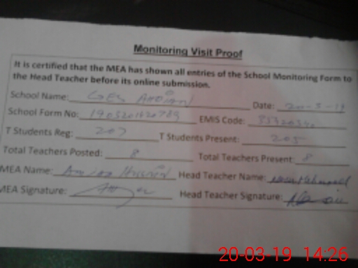 | Certified that this School was Inspected by the Undersigned MEA/DMO Today and the Information Stated Above is as Per Record. | |||||