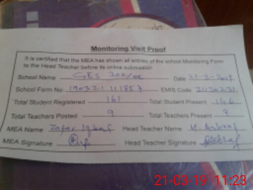 | EMIS Code: 31130231 | Name of School: GES CHAK NO 302 HR | |||