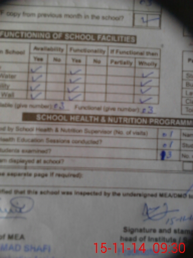 | School Visited by School Health & Nutrition Supervisor (No. of Visits) | 1 | Name1: | Syed Muhammad Javed | Name2: | |