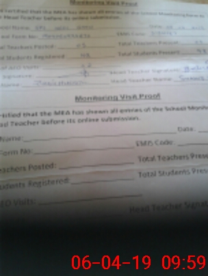 | Total no. of Classrooms: 6 No. of Classrooms Used for Teaching: 6 No. of Classrooms Storing Old Furniture, FTBs, etc: 0Comments if Any: Satisfactory The ex Pakistan leave of Mukhtiar Ahmad was Sanctioned up to 31st of March 2019 and the teacher report back He is considered ABSENT UNAUTHORISED |