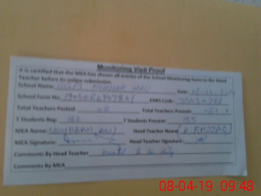 | Attendance Register | Head Teacher | MEA with School | Visit Proof |
