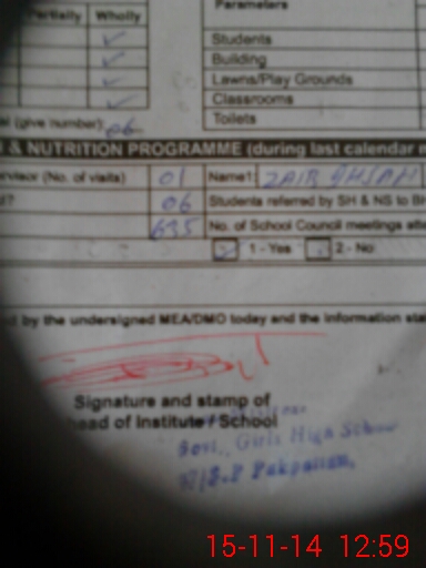 | School Visited by School Health & Nutrition Supervisor (No. of Visits) | 1 | Name1: | Zaib Ihsan | Name2: | |