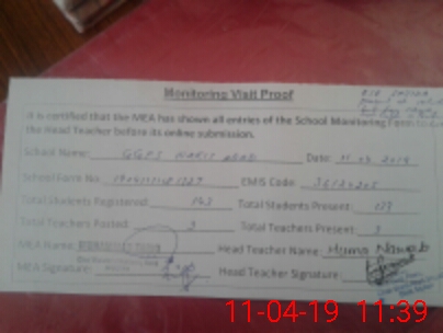 | Attendance Register | Head Teacher | MEA with School | Visit Proof |