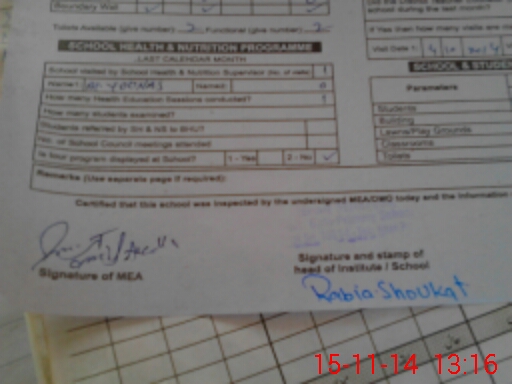 | School Visited by School Health & Nutrition Supervisor (No. of Visits) | 1 | Name1: | M Younas | Name2: | Nil |