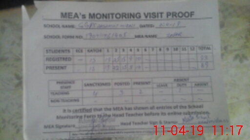 | Attendance Register | Head Teacher | MEA with School | Visit Proof |
