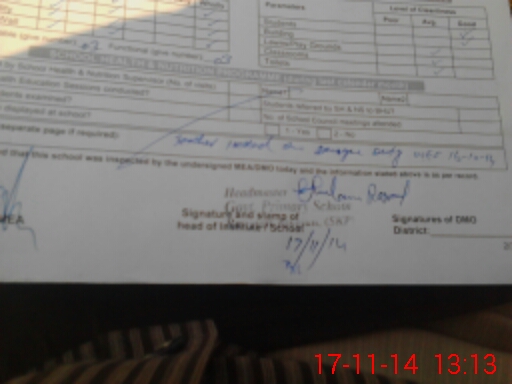 | Total no. of Classrooms: 2 No. of Classrooms Used for Teaching: 2 No. of Classrooms Storing Old Furniture, FTBs, etc: 0Comments if Any: Teacher imdaduallah on Daunge duty w e f 16 october2014 |