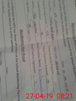 | Attendance Register | Head Teacher | MEA with School | Visit Proof |