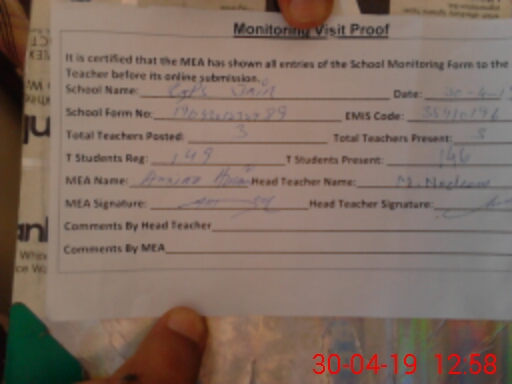 | Attendance Register | Head Teacher | MEA with School | Visit Proof |
