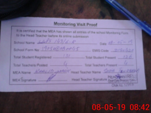 | Attendance Register | Head Teacher | MEA with School | Visit Proof |