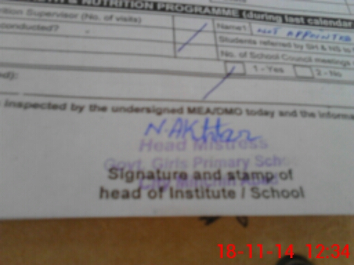 | School Visited by School Health & Nutrition Supervisor (No. of Visits) | Name1: | Not Appinyrd | Name2: | ||