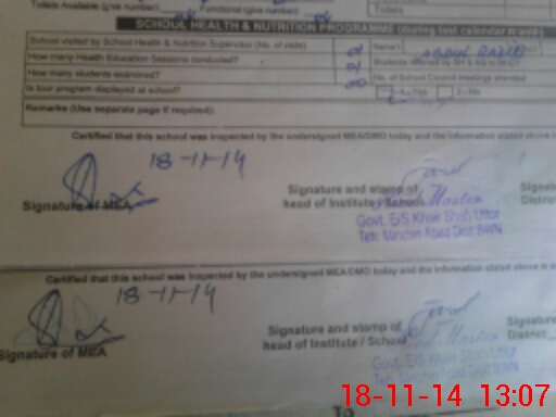 | School Visited by School Health & Nutrition Supervisor (No. of Visits) | 1 | Name1: | ABDUL RAZIQ | Name2: | |