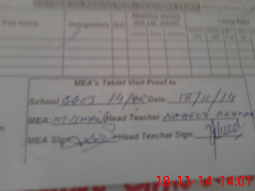 | Attendance Register | Head Teacher | MEA with School | Visit Proof |
