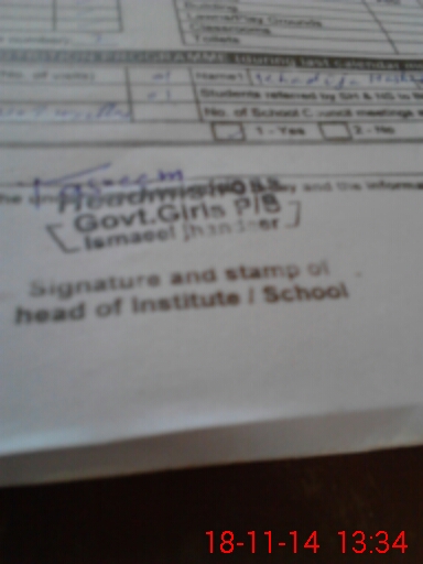 | School Visited by School Health & Nutrition Supervisor (No. of Visits) | 1 | Name1: | KHADIJA HASHMI | Name2: | |