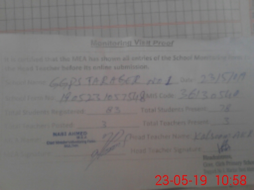 | EMIS Code: 36130540 | Name of School: GGPS TARAGER NO.1 | |||