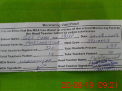 | Attendance Register | Head Teacher | MEA with School | Visit Proof |