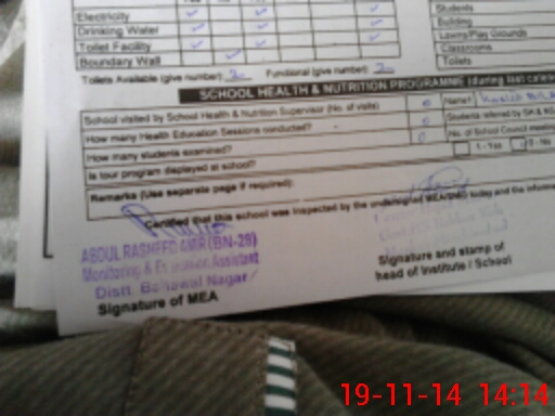 | School Visited by School Health & Nutrition Supervisor (No. of Visits) | Name1: | Khalid Bilal | Name2: | ||