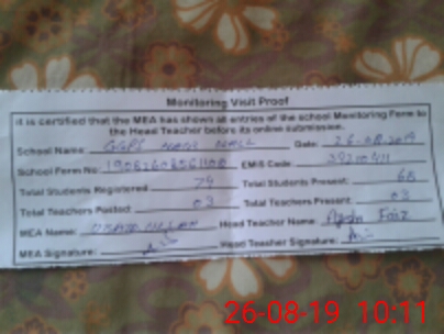 | Certified that this School was Inspected by the Undersigned MEA/DMO Today and the Information Stated Above is as Per Record. | |||||