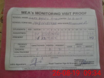 | Attendance Register | Head Teacher | MEA with School | Visit Proof |