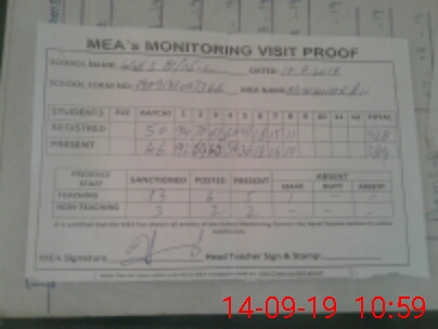 | Attendance Register | Head Teacher | MEA with School | Visit Proof |