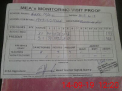 | Attendance Register | Head Teacher | MEA with School | Visit Proof |