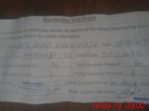 | EMIS Code: 36120058 | Name of School: GPS ASAD KHAN WALA OUT SIDE CHOWTAQA GATE P/O SHUJABAD | |||