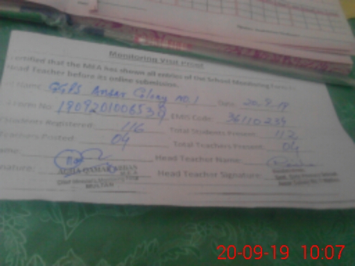 | EMIS Code: 36110234 | Name of School: GGPS ANSAR COLONY NO.1 MULTAN | |||