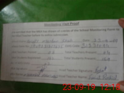 | Attendance Register | Head Teacher | MEA with School | Visit Proof |