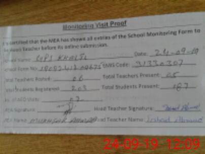 | Attendance Register | Head Teacher | MEA with School | Visit Proof |