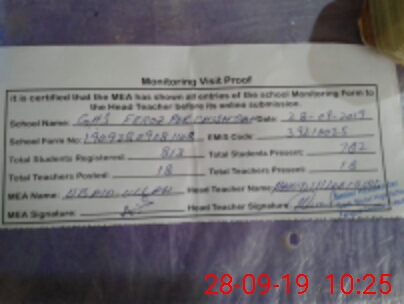 | Attendance Register | Head Teacher | MEA with School | Visit Proof |