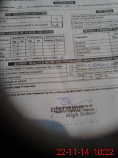 | School Visited by School Health & Nutrition Supervisor (No. of Visits) | 1 | Name1: | Muhammad Ramzan Bhatti | Name2: | |