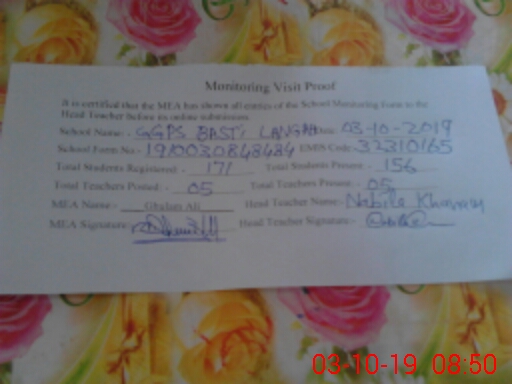 | EMIS Code: 32310165 | Name of School: GGPS BASTI LANGAH | |||