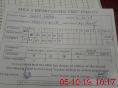 | Attendance Register | Head Teacher | MEA with School | Visit Proof |