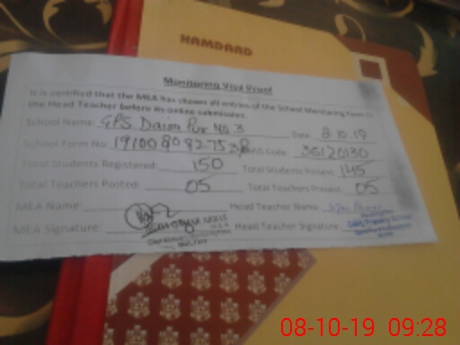 | EMIS Code: 36120130 | Name of School: GPS DAIRA PUR NO. 3 SHUJA ABAD | |||