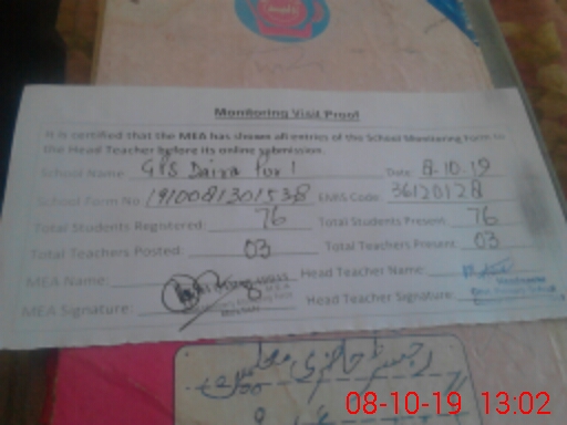 | EMIS Code: 36120128 | Name of School: GPS DAIRA PUR 1 P/O SIKANDARABAD SHUJABAD | |||