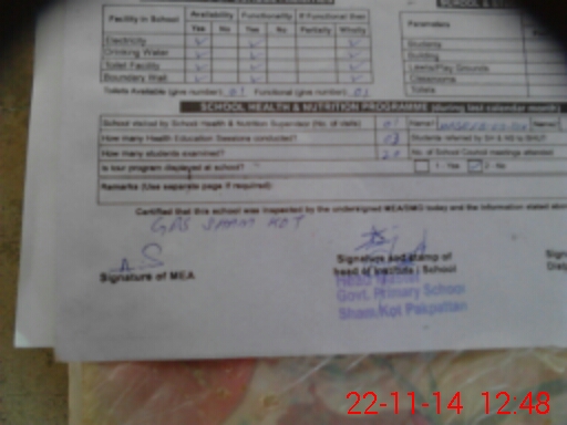 | School Visited by School Health & Nutrition Supervisor (No. of Visits) | 1 | Name1: | HASEEB UD DIN | Name2: | |