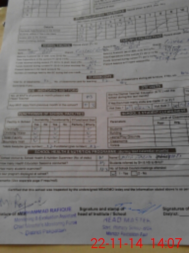 | School Visited by School Health & Nutrition Supervisor (No. of Visits) | 1 | Name1: | Atif Farid Chishti | Name2: | |