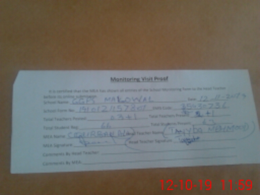 | Attendance Register | Head Teacher | MEA with School | Visit Proof |