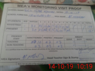 | Attendance Register | Head Teacher | MEA with School | Visit Proof |