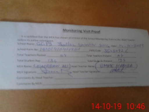 | Attendance Register | Head Teacher | MEA with School | Visit Proof |
