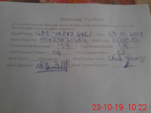 | EMIS Code: 32310112 | Name of School: GPS YARAY WALI | |||