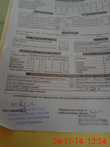| School Visited by School Health & Nutrition Supervisor (No. of Visits) | 1 | Name1: | Atif Farid Chishti | Name2: | |