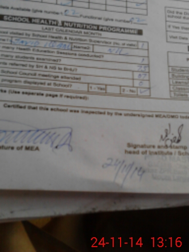 | School Visited by School Health & Nutrition Supervisor (No. of Visits) | 1 | Name1: | Javid Iqbal | Name2: | Nil |